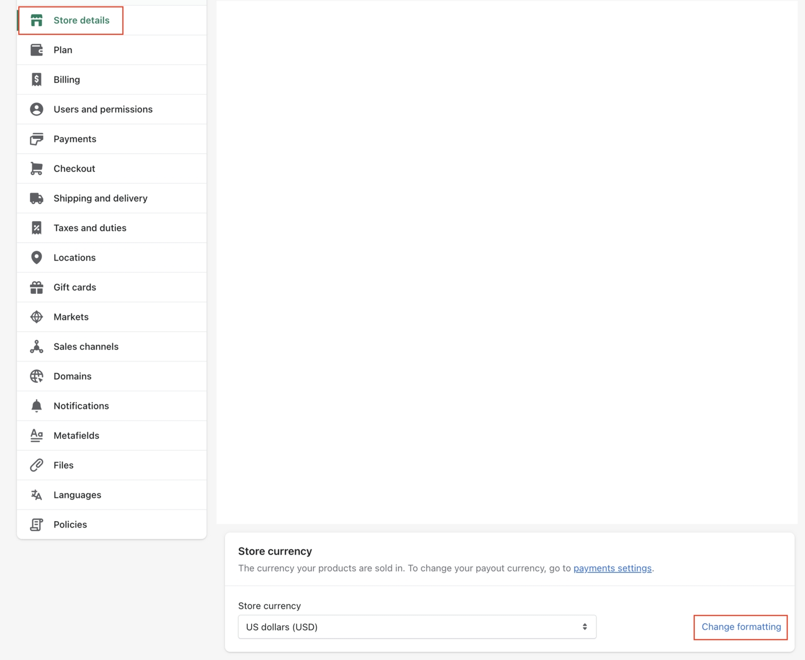 Step 1: Shopify Admin > Settings > Store details > Store currency > Change formatting
