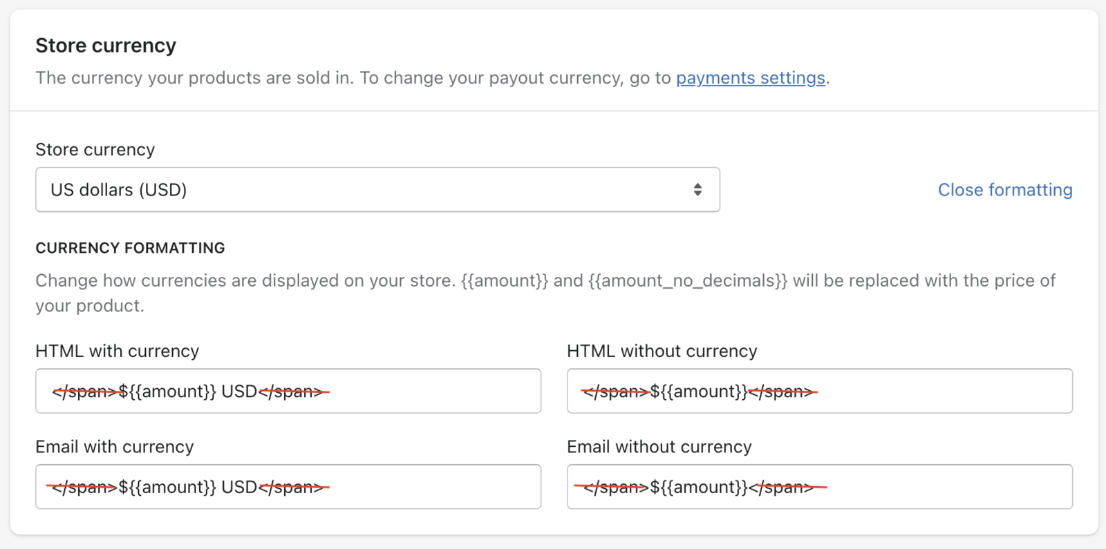 Like in the example below, the </span> is removed in all 4 boxes leaving the ${{amount}} USD and ${{amount}}.
